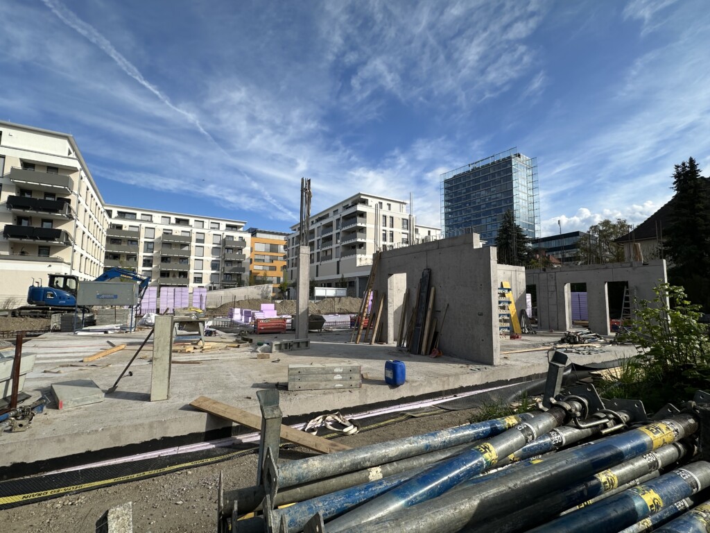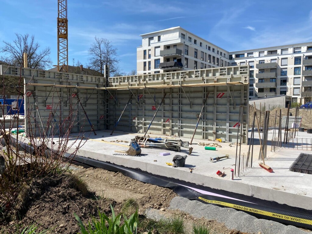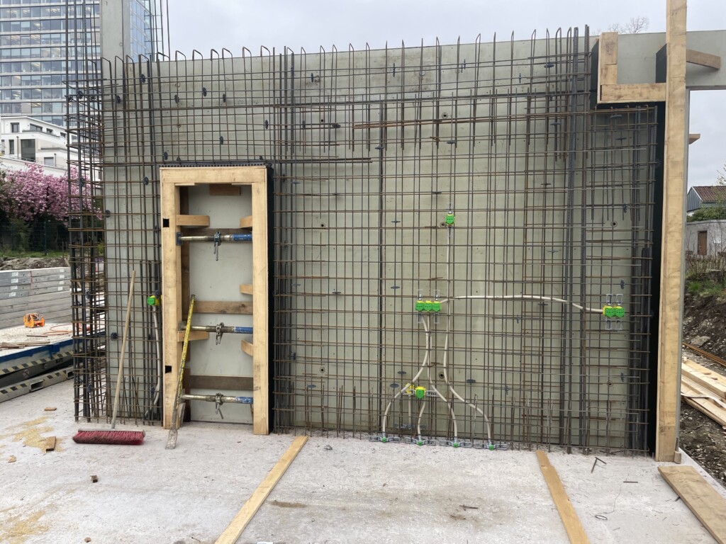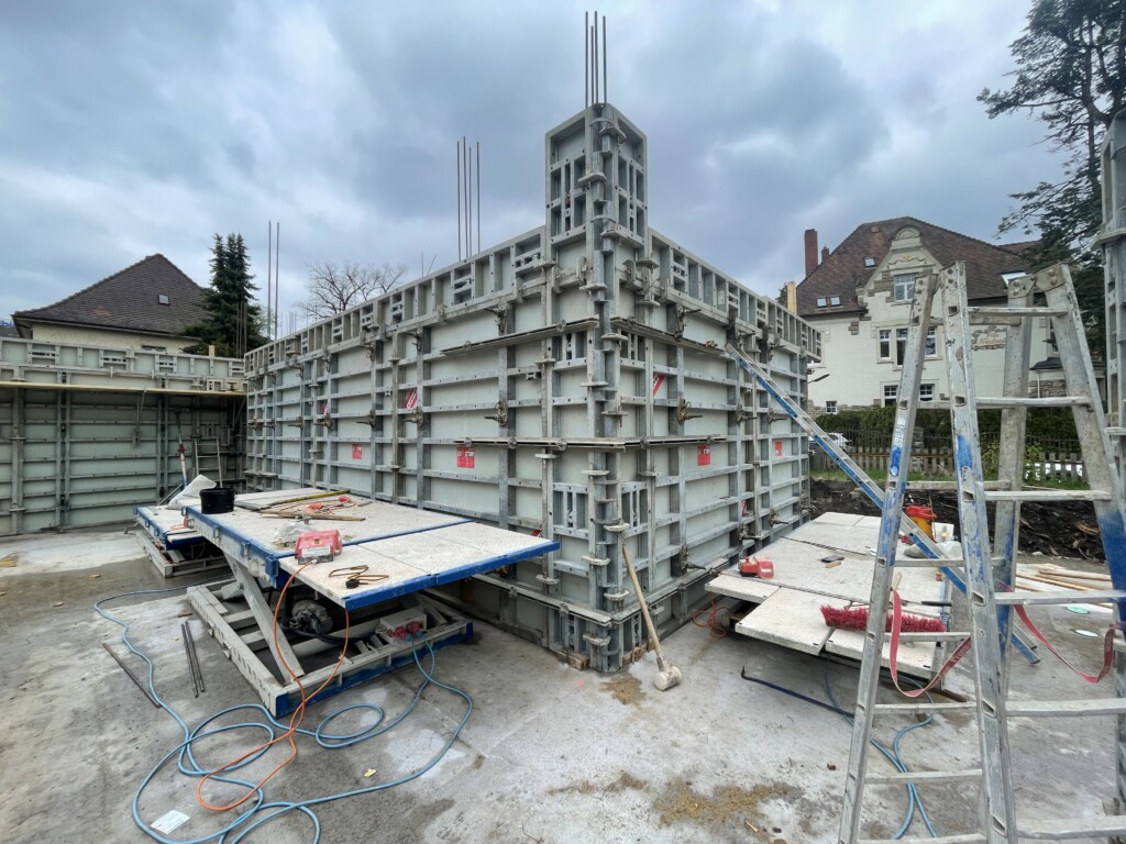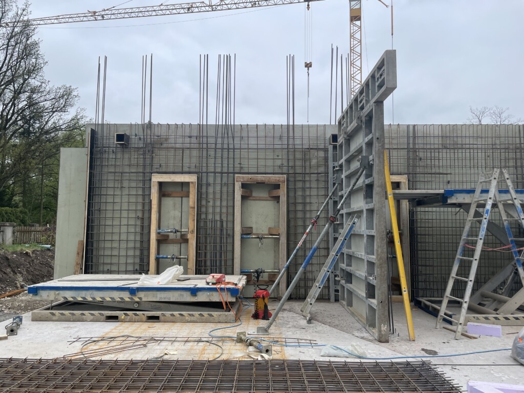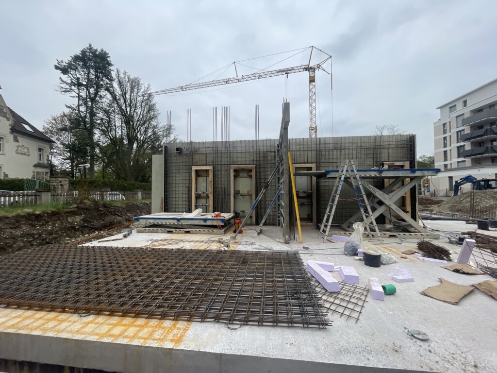 Nachdem die Bodenplatte getrocknet ist, werden die ersten Massivbetonwände vorbereitet …