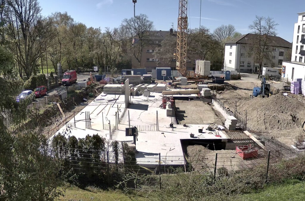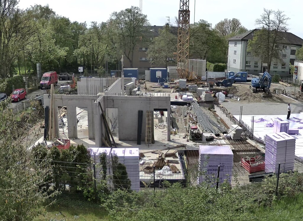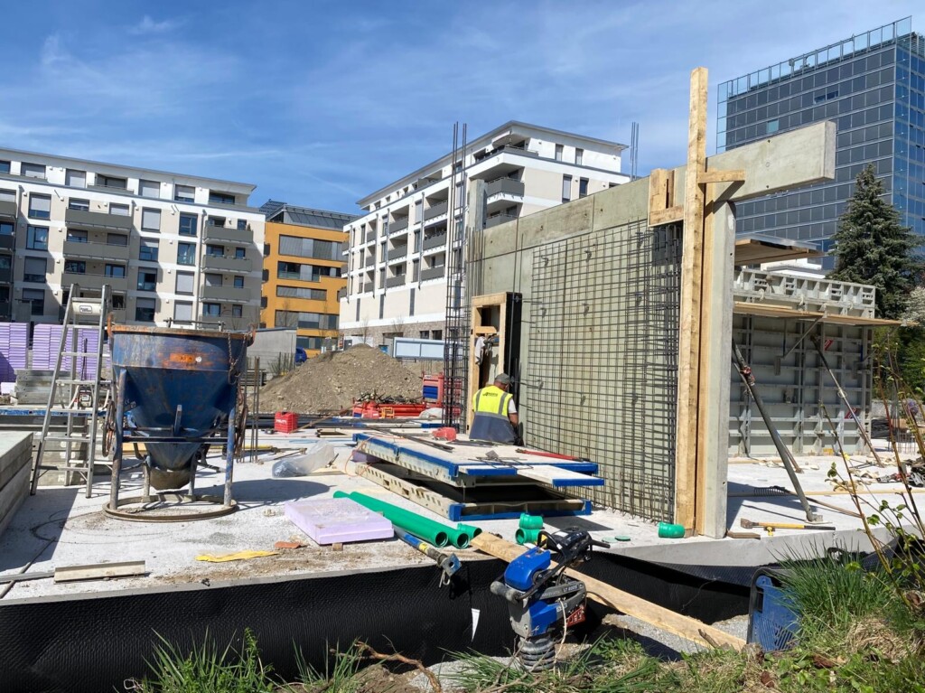 Nach dem Betonieren werden die Schalungen wieder entfernt und zeitgleich bereits der zweite Gebäudeteil (Gottesdienstraum) für das Betonieren der Bodenplatte vorbereitet.
